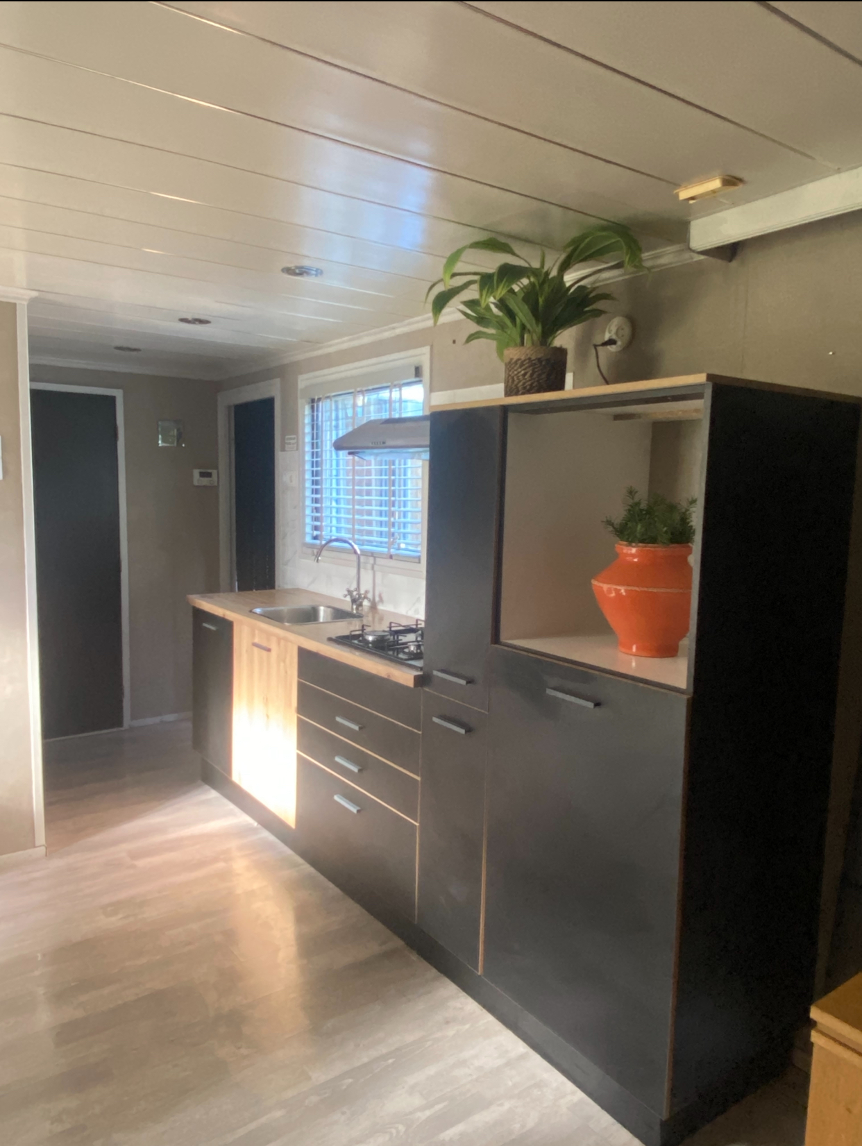 Keuken:, 4-pitsgasstel met gasoven en -grill, afzuigkap, koel-vriescombinatie -